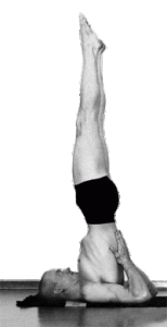 Llevamos las piernas flexionadas sobre el cuerpo; con las manos en el suelo podemos aprovechar para levantar la pelvis y las piernas a la vertical (en mi práctica primero hago Halasana, yendo con las piernas hacia atrás mientras colocamos las manos planas en la espalda y los codos lo más juntos posible, sin que sea excesivamente incómodo; a partir de aquí subo a Sarvangansana).